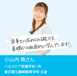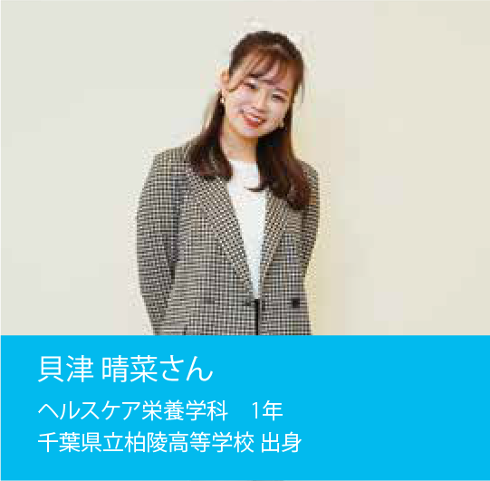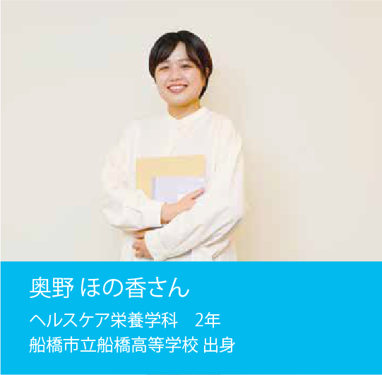 栄養士として働きたいという明確な目標に向かって、一つひとつの授業に集中。栄養学や衛生管理だけでなく、人体の構造や機能について学ぶ解剖学など、幅広い領域を凝縮して習得することで、自分の成長を感じることができました。